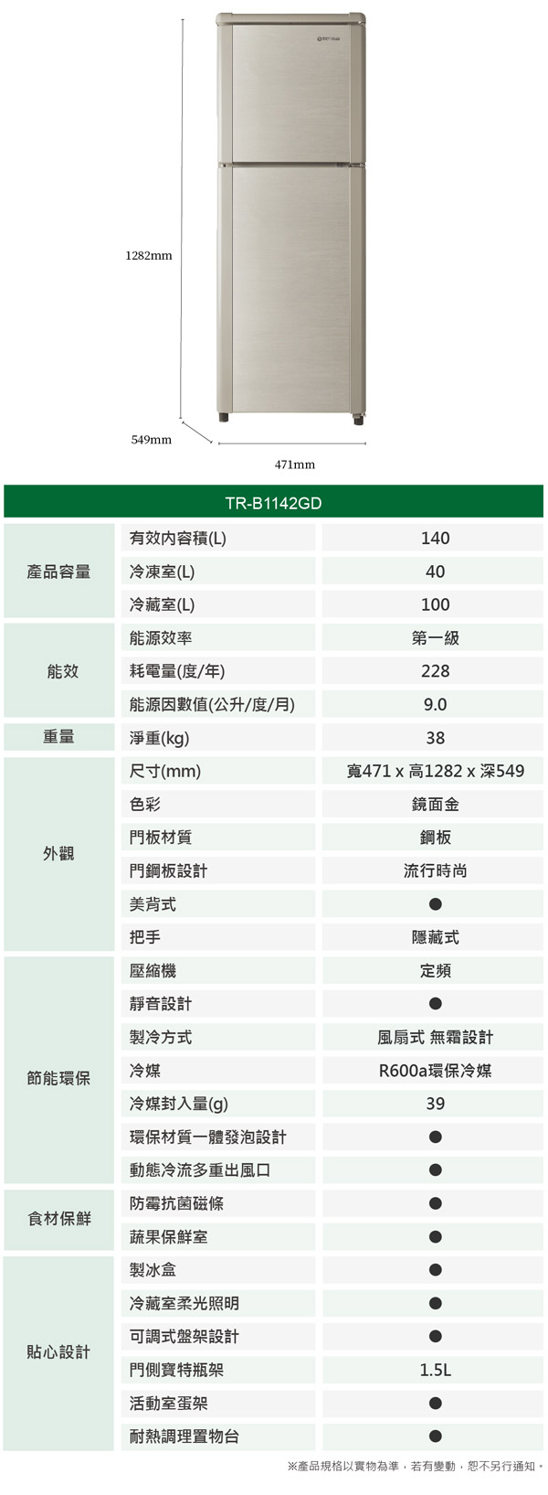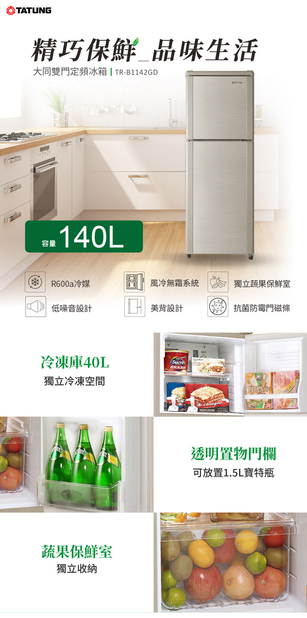 $23,900【TATUNG大同】89公升一級能效定頻雙門冰箱 (TR-B191HW)