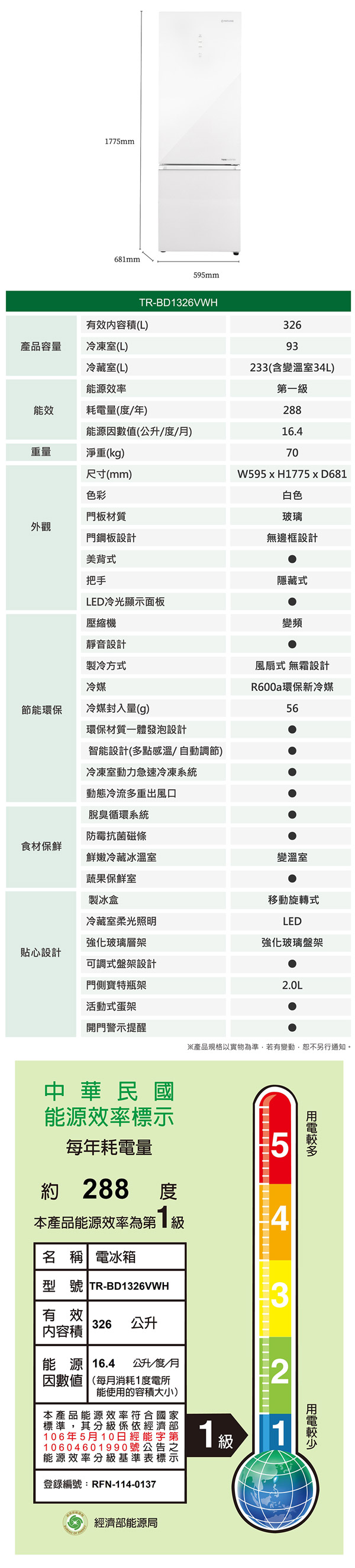 $44,900【TATUNG大同】250公升一級能效變頻雙門冰箱 (TR-B1258VWH)