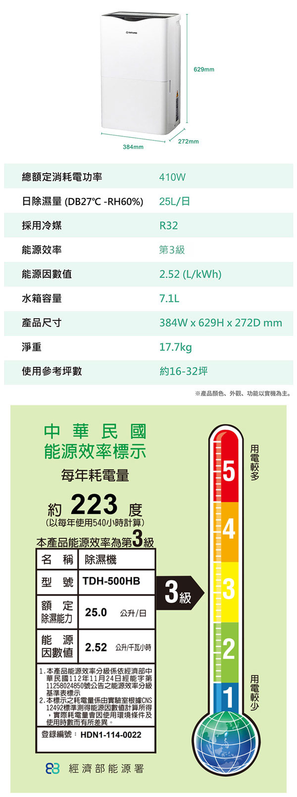 大同除濕機 25公升 TDH-500HB|適用16-32坪|節能靜音大坪數適用