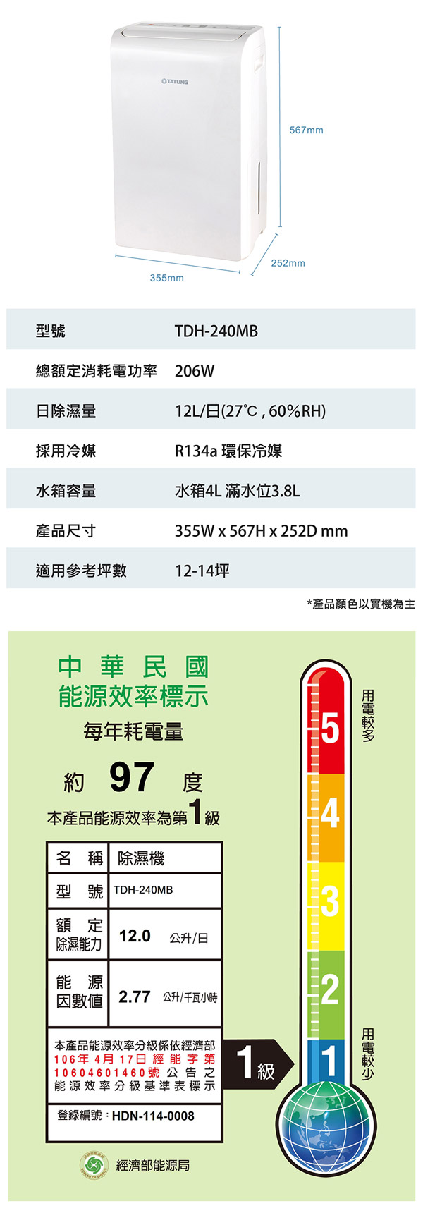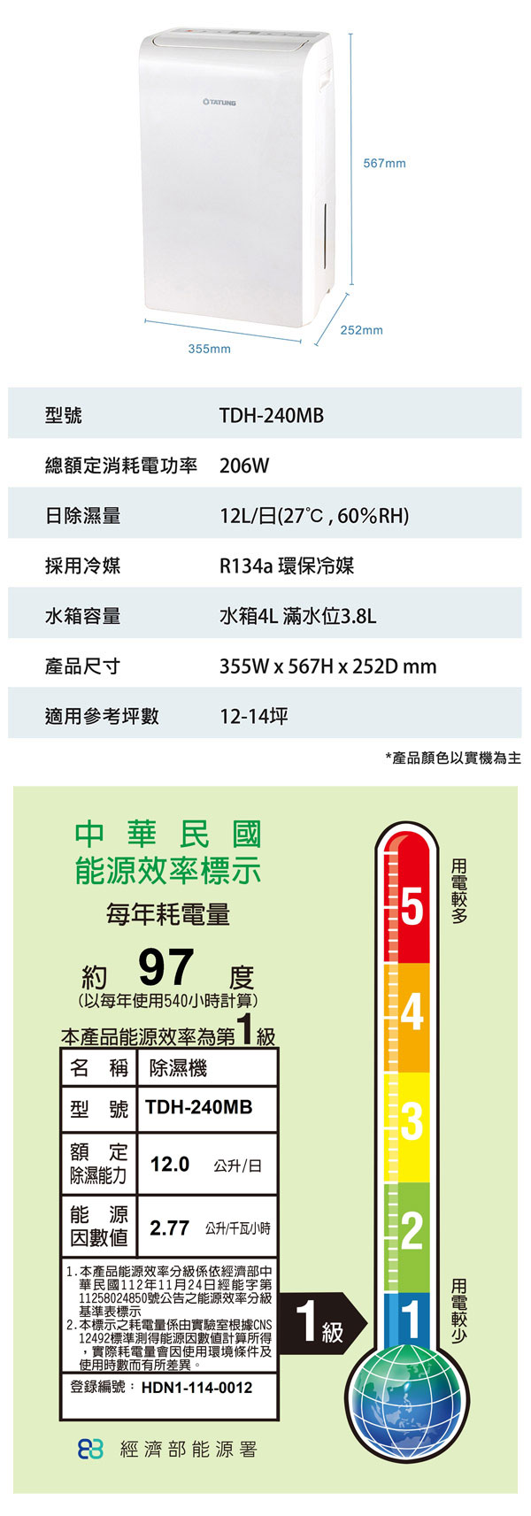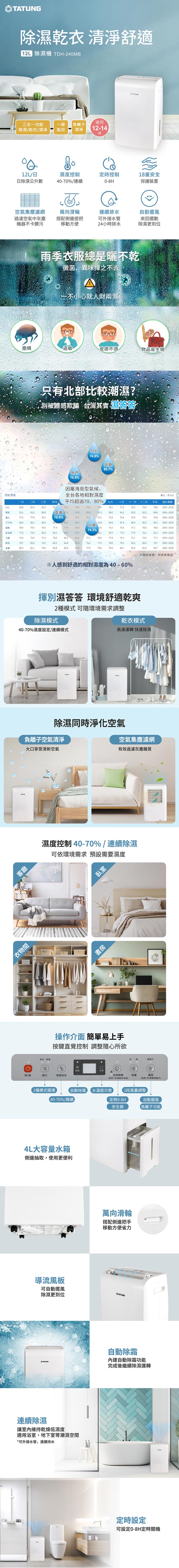 12公升 適用12~14坪 TDH-240MB 一級能效大同除濕機 三合一功能