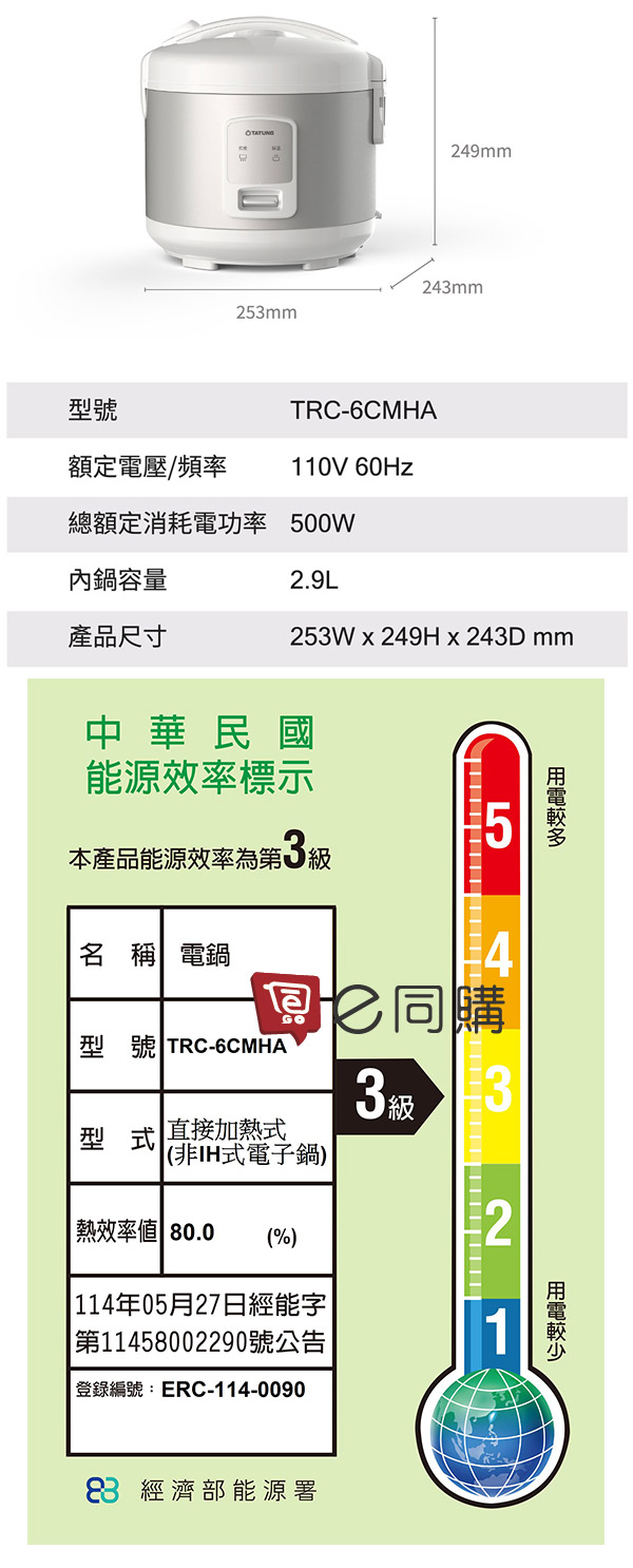 大同電子鍋 3人份機械式電子鍋 TRC-3CMA